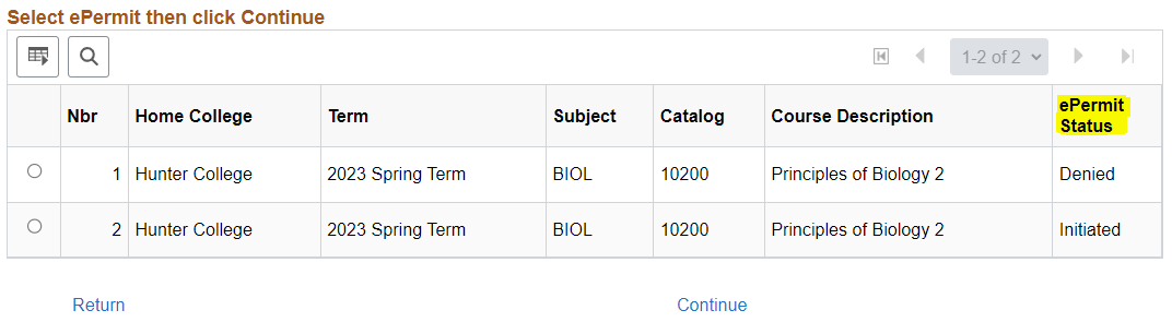 To review the eRegistrar comments or committee responses to your ePermit if you are DENIED OR APPROVED, select the radio button next to the ePermit and press 'Continue':