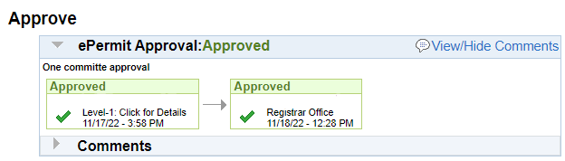 7A. If your ePermit was forwarded to an academic department or program, you will see the Approve table below the eRegistrar comments section by scrolling down: