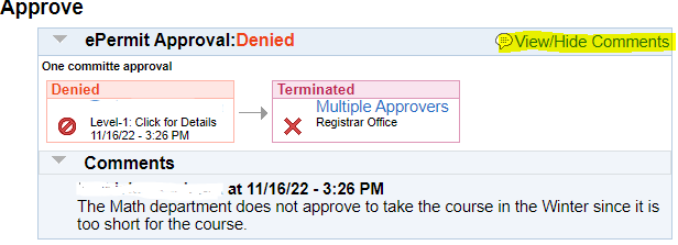 7B. Click on View/Hide Comments, this will only be visible if the committee members have left you information (**especially for CHEMISTRY ePermit approvals**)